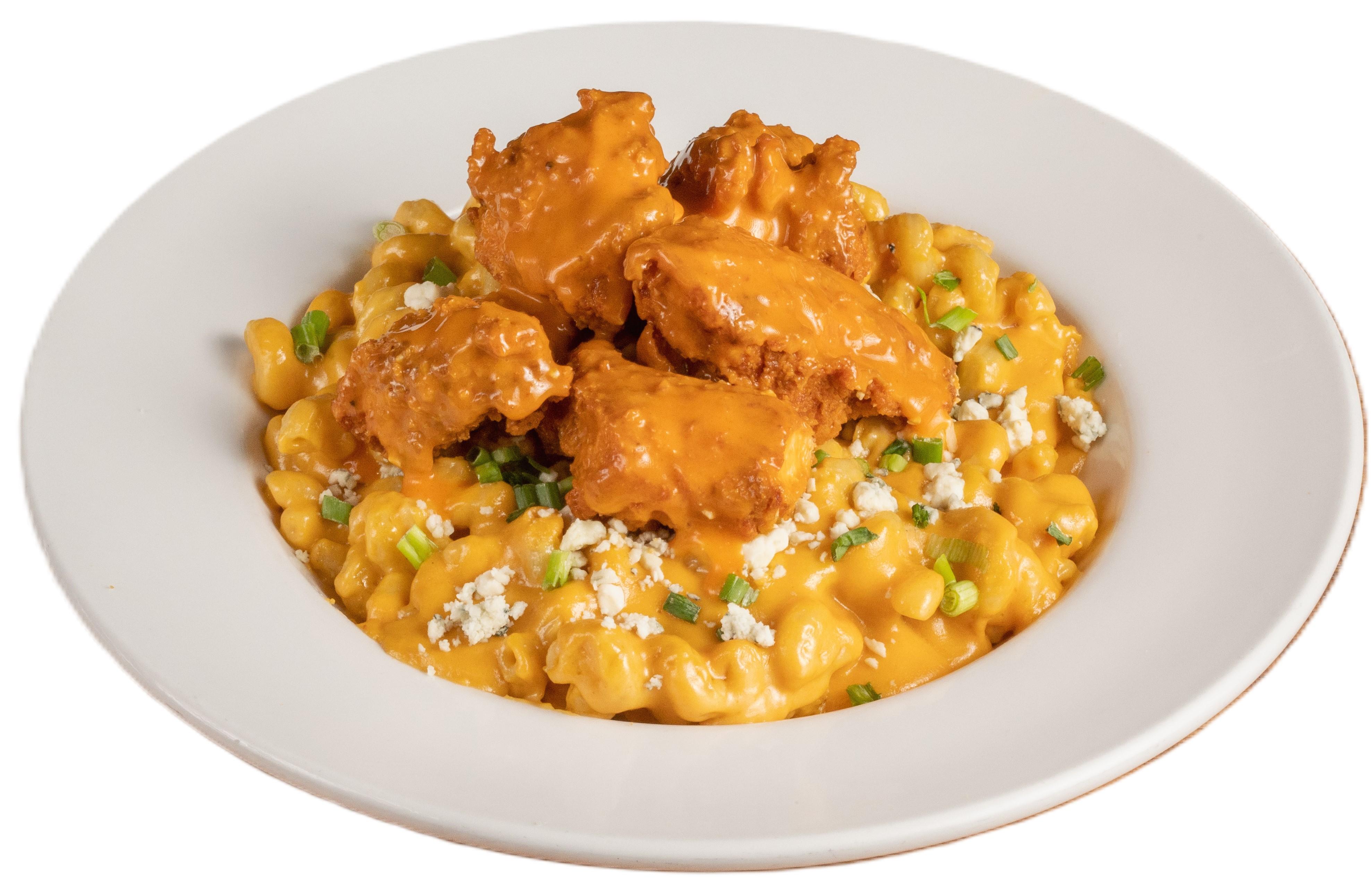 Heaping portion of our gooey mac and cheese topped with boneless wings coated with our Original (Medium) Anchor Bar Wing Sauce. Topped with crumbled bleu cheese and green onions. Mac & Cheese without chicken 11.99