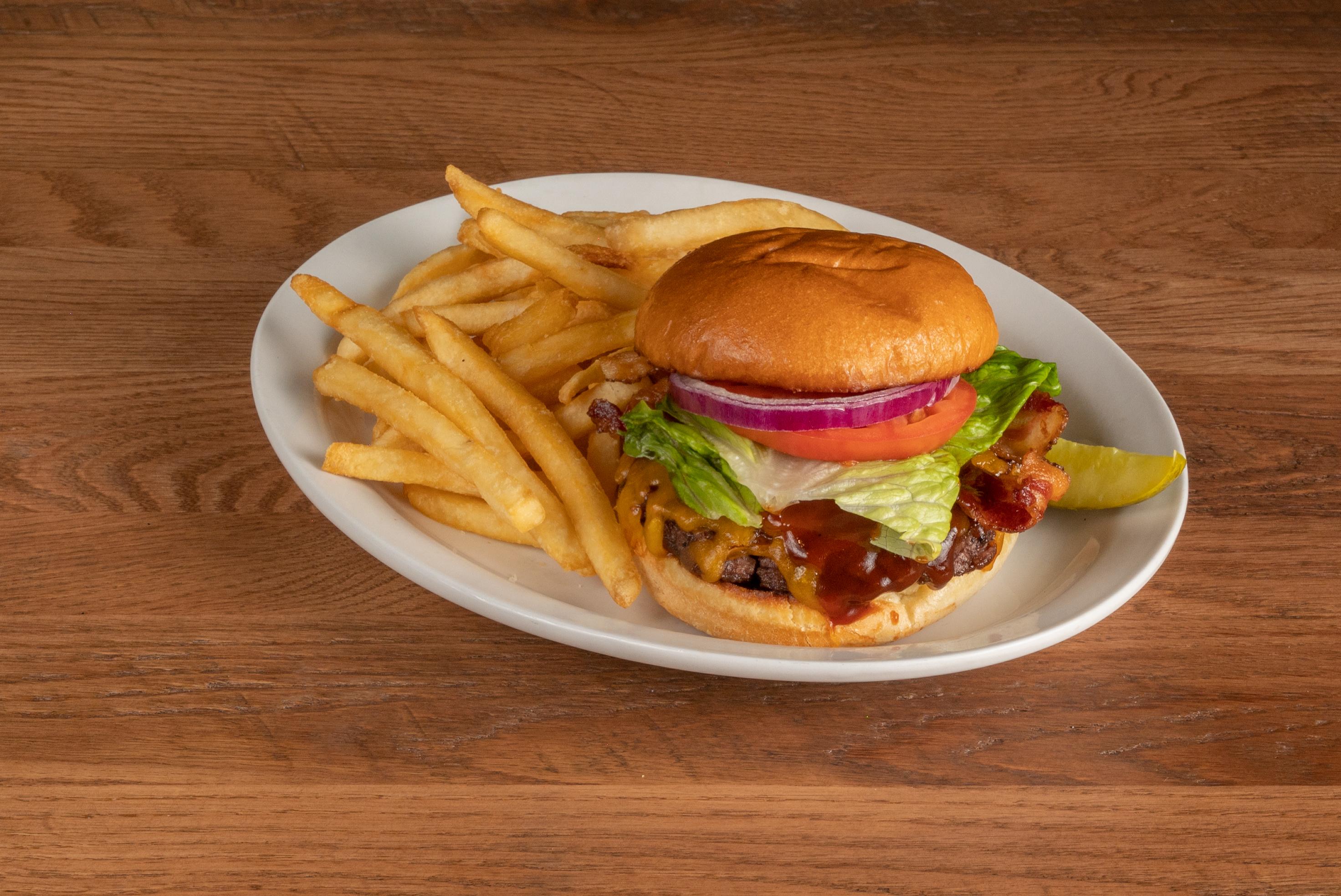 Our fresh angus beef patty topped with cheddar cheese, Anchor Bar's spicy BBQ Sauce, crisp bacon, lettuce, tomato and red onion on a brioche roll.
