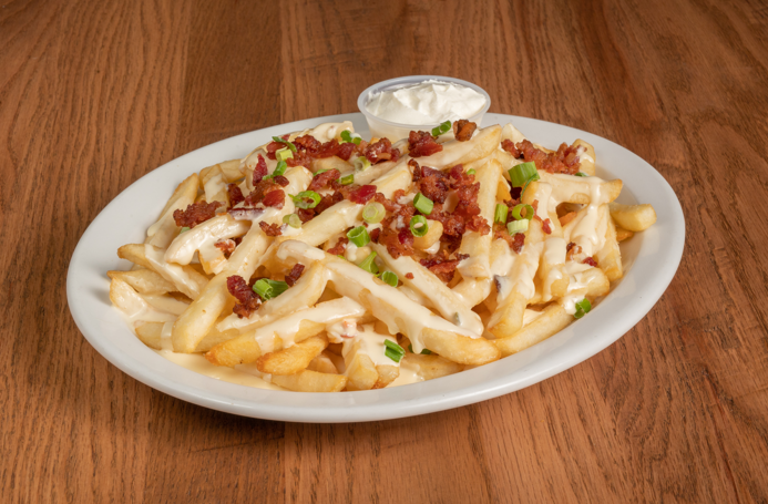A generous portion of our fries smothered in white queso, topped with bacon, green onions and a side of sour cream. Add pickled jalapenos for +.59