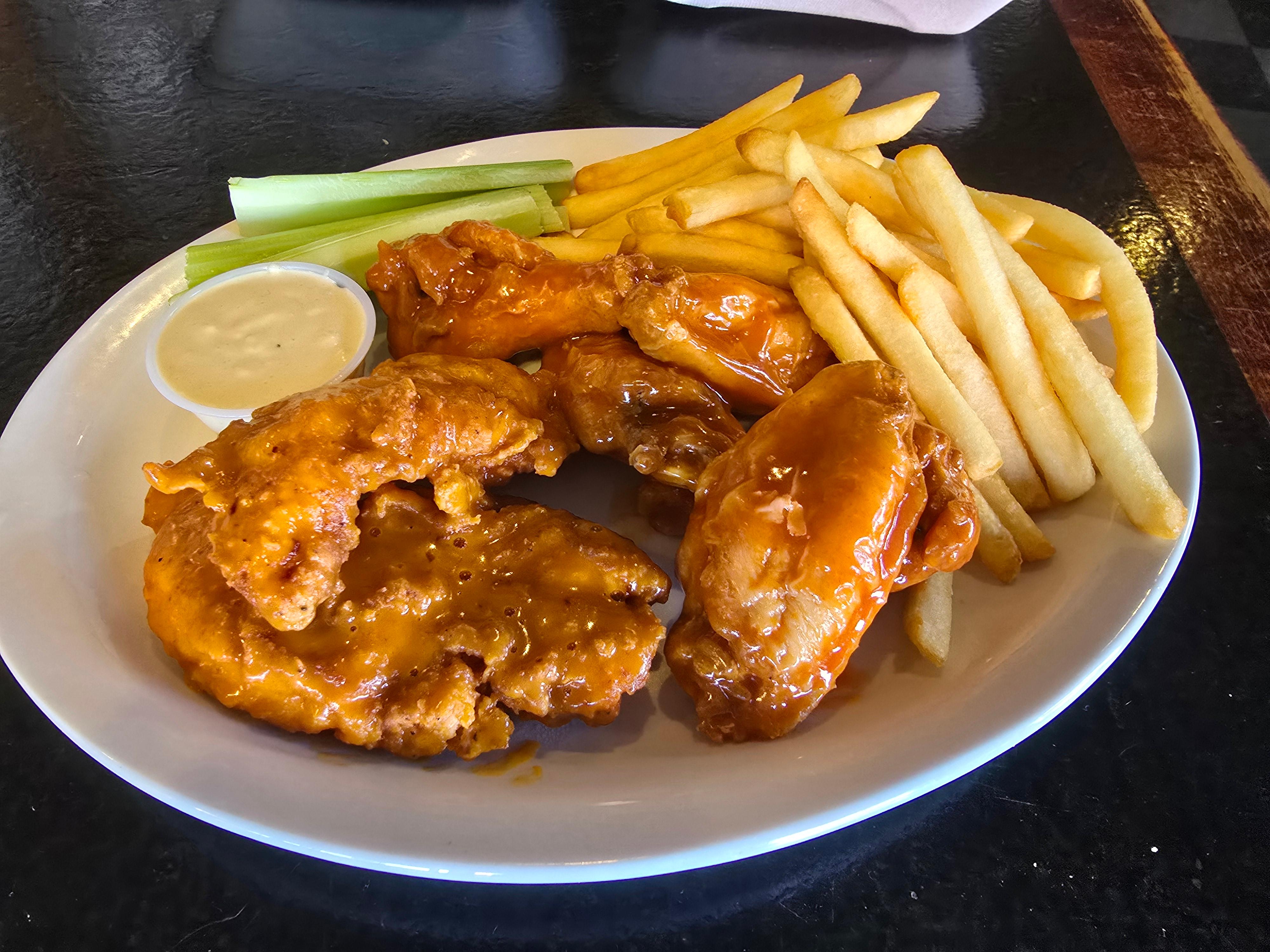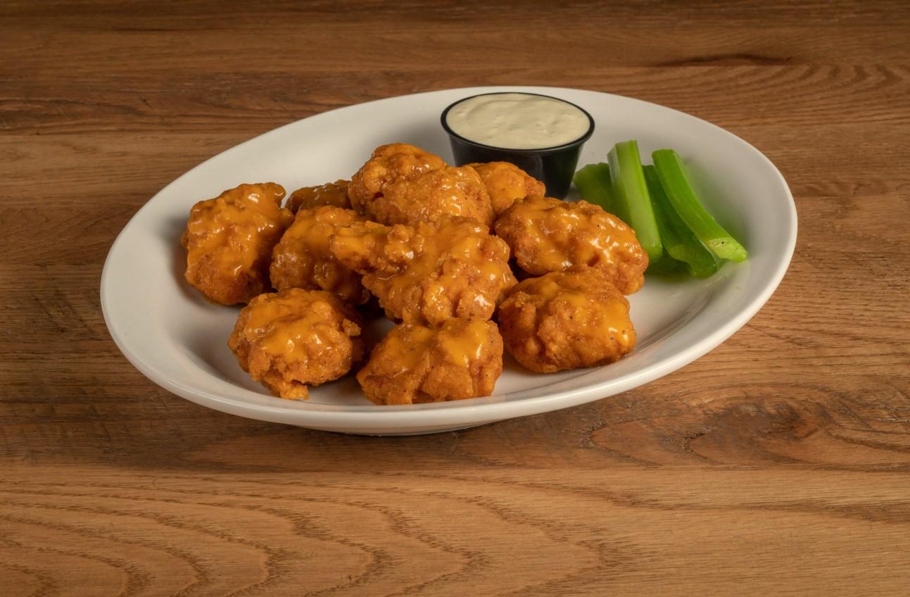 10 Fresh, white meat chicken breast chunks, breaded in house, deep fried to perfection, tossed with your choice of sauce. Served with bleu cheese and celery.