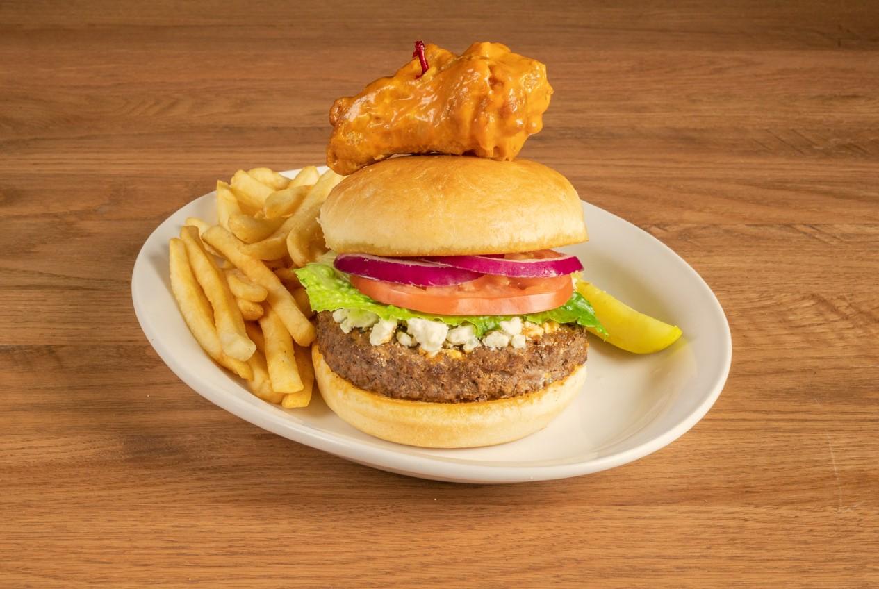Our fresh Angus beef patty smothered in our Original (Medium) Anchor Bar Wing Sauce. Topped with crumbled bleu cheese, lettuce, tomato and red onion on a fresh kaiser roll. Crowned with our World Famous Chicken Wing!
