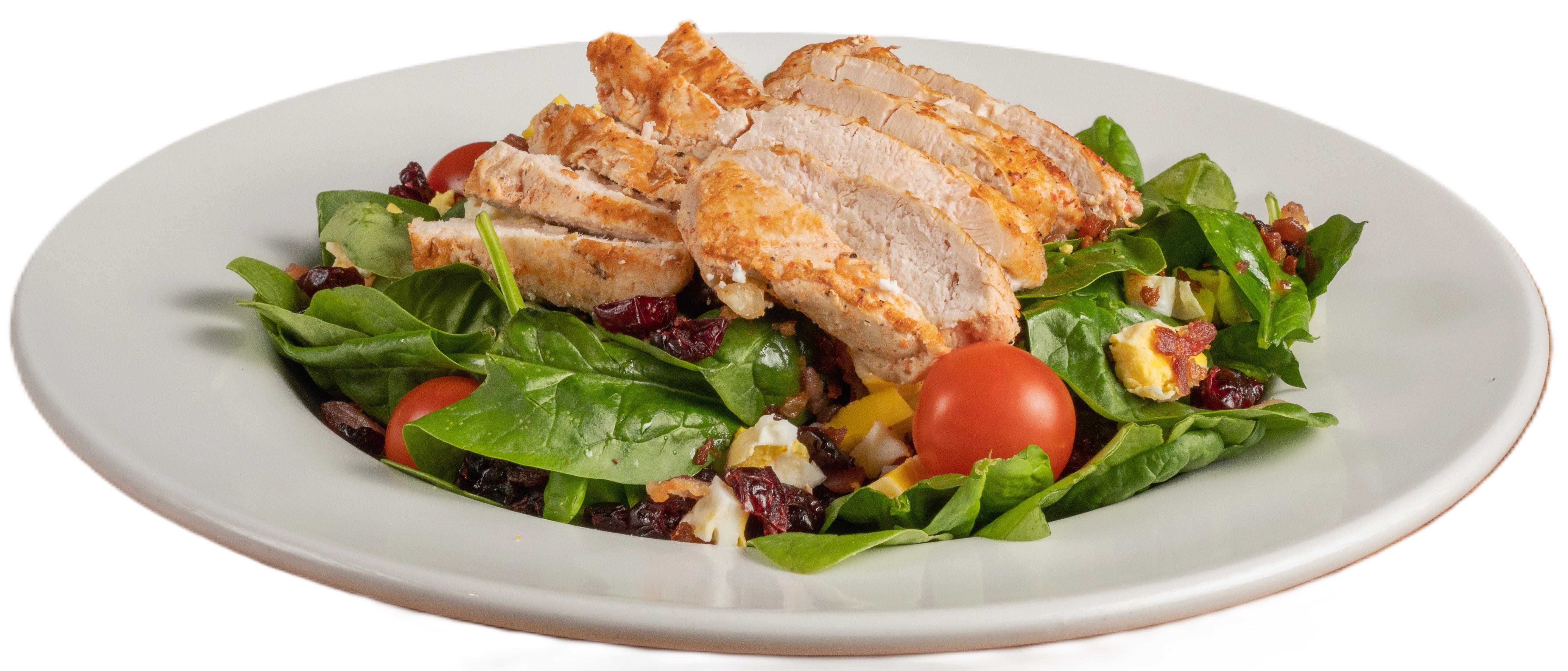 Fresh spinach topped with chopped bacon, tomatoes, dried cranberries, and grilled chicken. Served with balsamic vinaigrette dressing. Sub crispy for grilled chicken.
