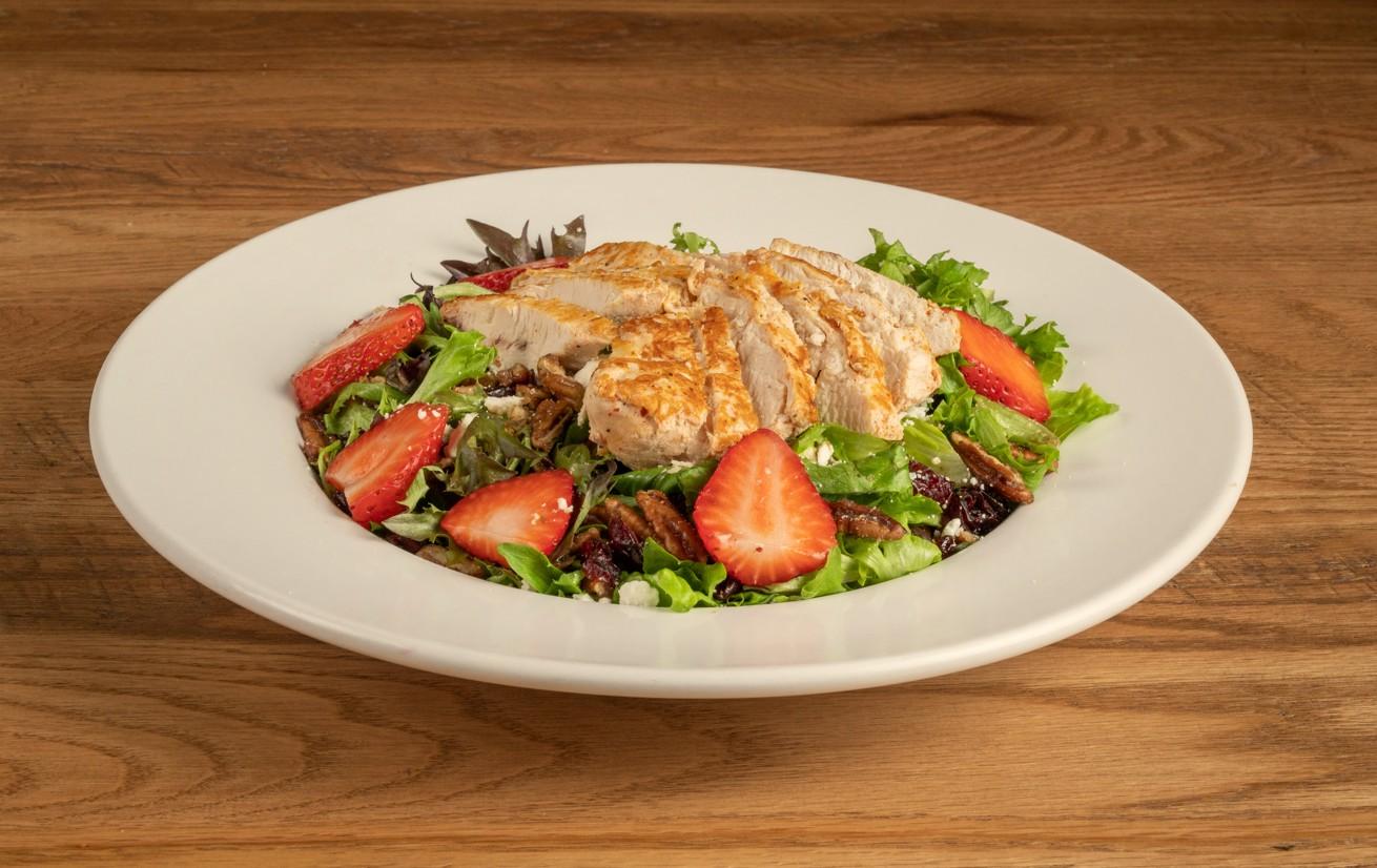Mixed greens topped with grilled chicken, strawberries, candied pecans and goat cheese. Served with raspberry vinaigrette dressing. Sub crispy chicken for grilled.
