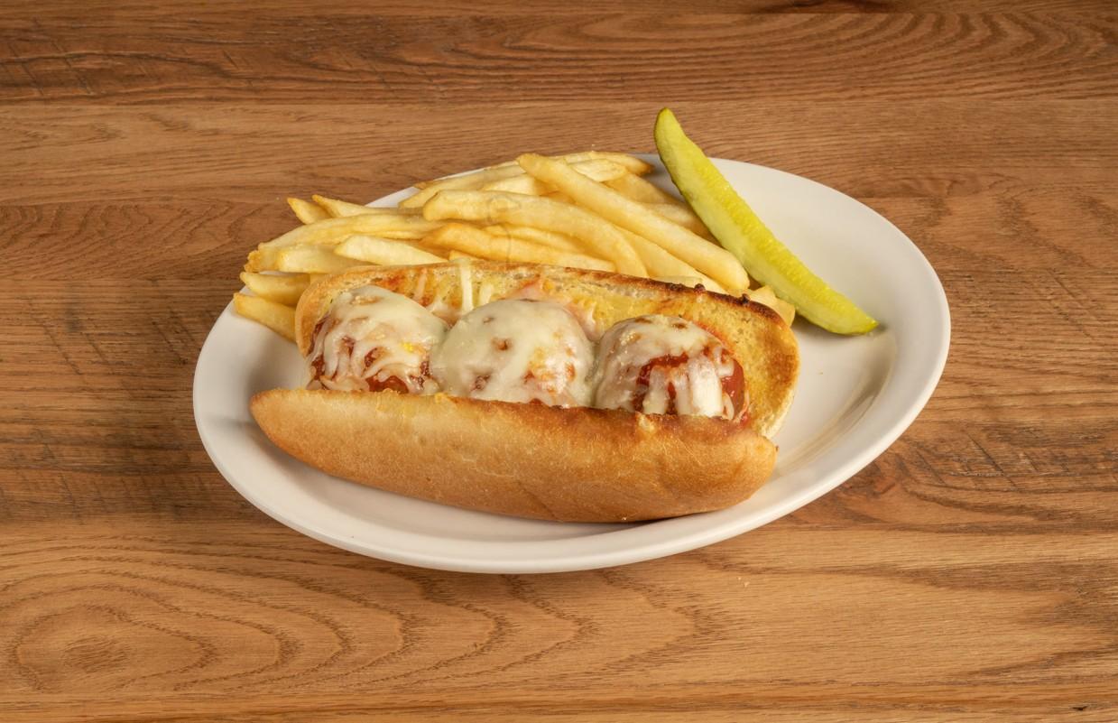 Perfectly seasoned meatballs covered with Anchor Bar homemade pasta sauce and mozzarella cheese served on a baked hoagie roll.