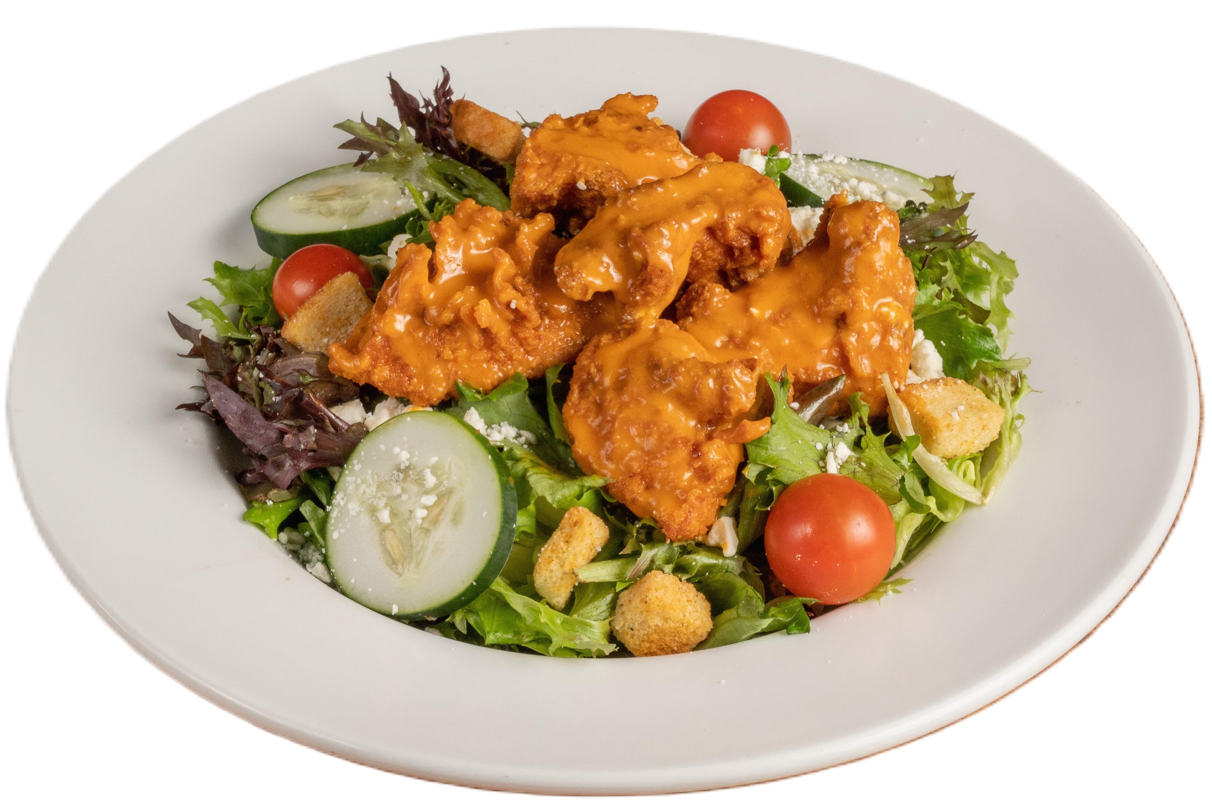 Crispy or grilled chicken strips tossed with Original (medium) Anchor Bar Wing Sauce or dry rub, served over mixed greens, cucumbers, tomatoes, croutons and crumbled bleu cheese. Served with a side of our Anchor Bar Creamy Bleu Cheese.