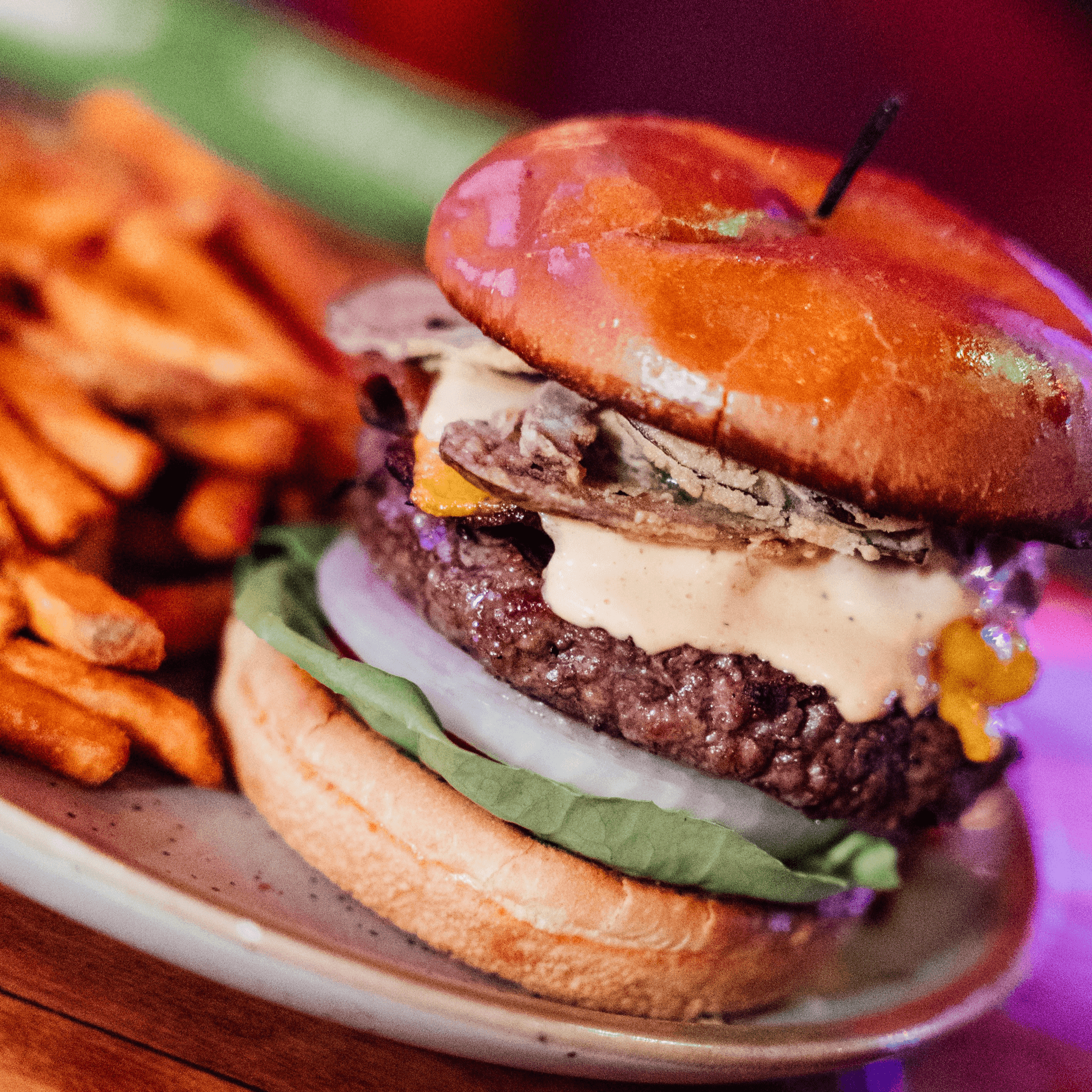Veggie patty, pickled red onion, avocado and chubasco aioli. 7 oz patty grilled to order served with seasoned fries, lettuce, tomato, and onion