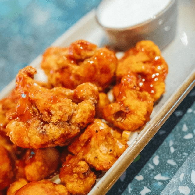 Tempura cauliflower, buffalo drizzle, choice of ranch or bleu cheese