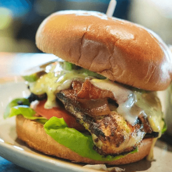 chicken breast, applewood smoked bacon, Swiss cheese, avocado, lettuce, tomato, chimichurri aioli. Includes a side of fries, coleslaw or beans