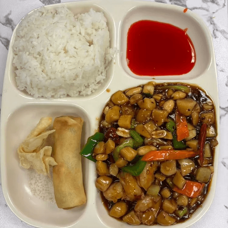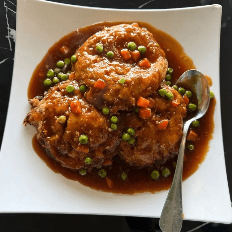 Veggie egg patties, deep-fried, served with your choice of protein in-house special brown sauce, accompanied by peas, carrots, mushroom pieces, yellow and green onions