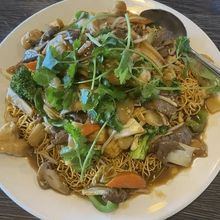 Chicken, beef, and shrimp with white & green onion and mushroom in hot and spicy sauce served with crispy rice noodle