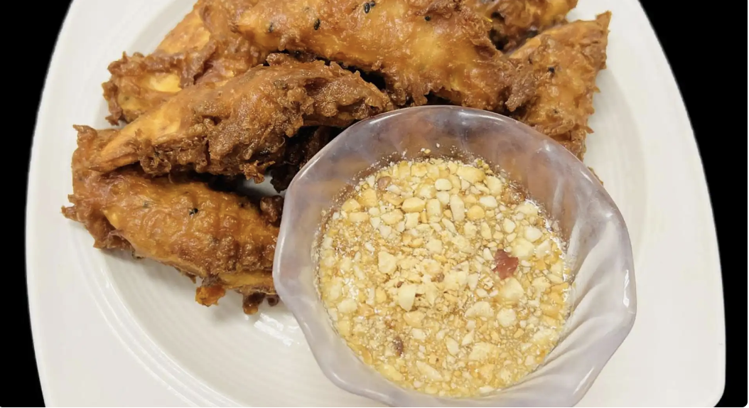 (Gluten free, vegan, peanut, soy free) batter with rice flour, sesame, coconut with dipping sauce