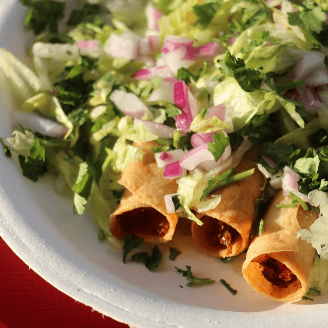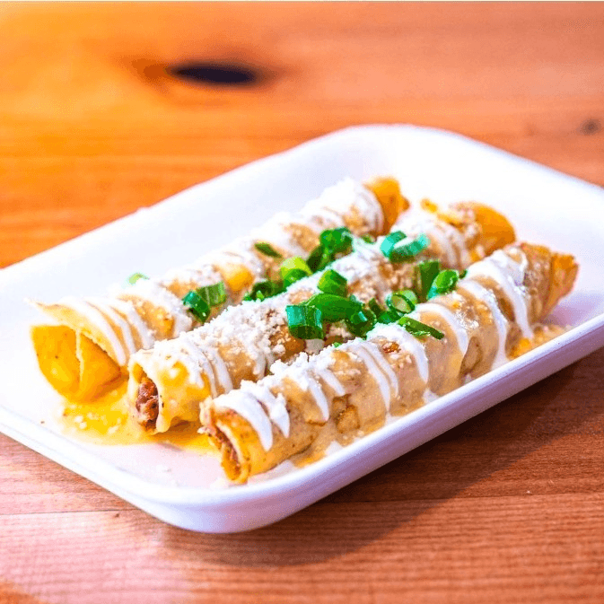 Crispy rolled tacos with your filling choice. Topped with green onion, cotija cheese, crema & queso sauce