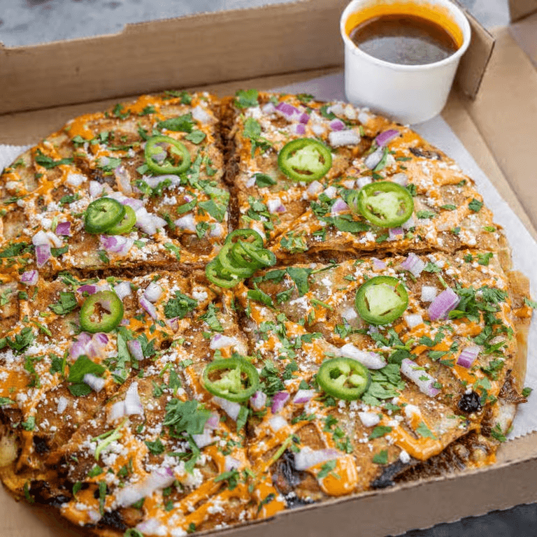 TOGETHER W/CHILE VERDE & CARAMELIZED ONION TOPPED W/JALAPENO, DICED RED ONION, CILANTRO & SPICY