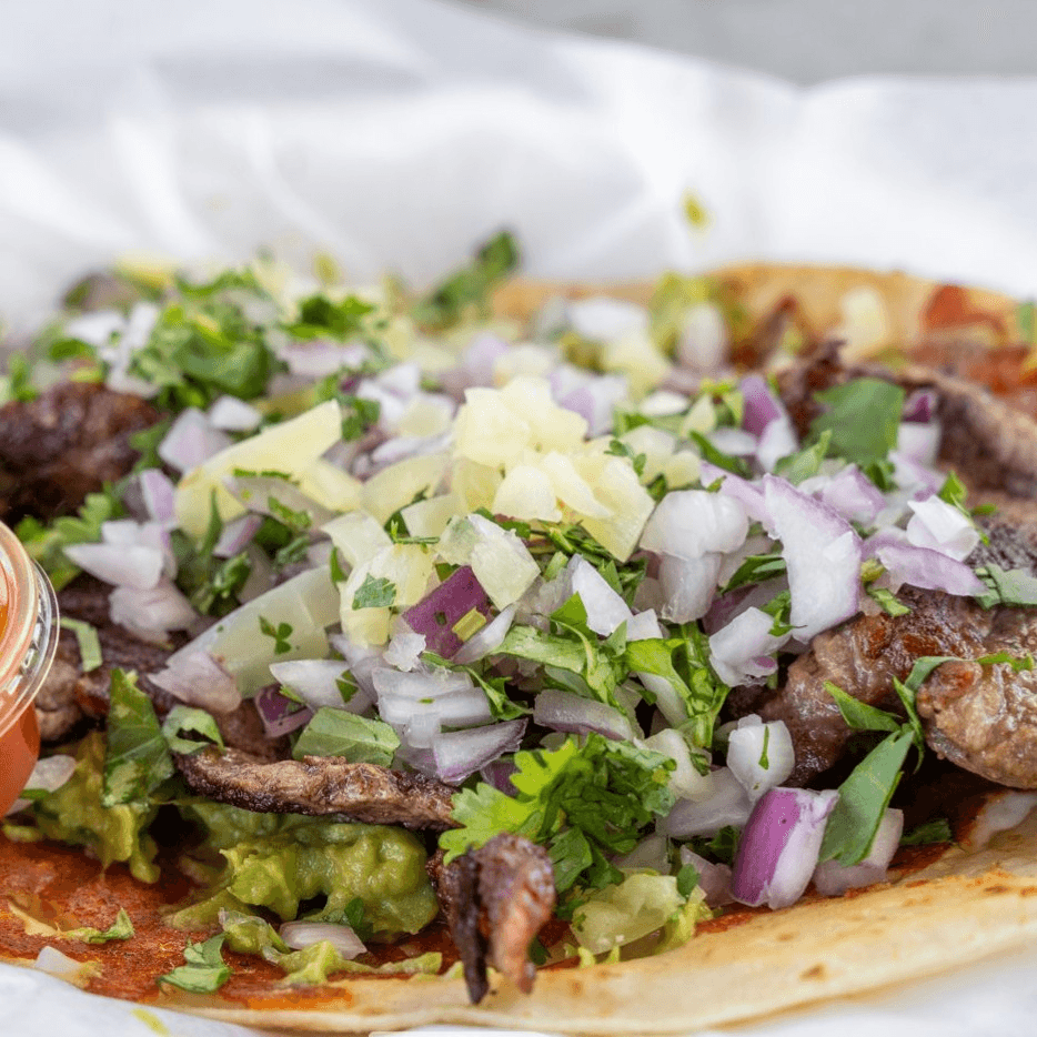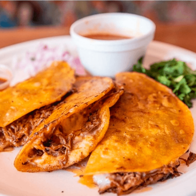 Soft corn tortilla folded with birria, topped with cabbage, diced onions & cilantro
