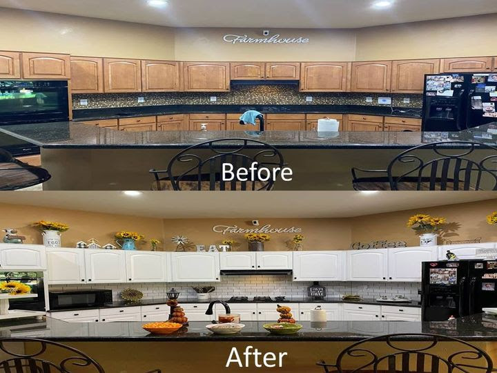 Refinish and repaint your kitchen, bathroom, laundry room, or garage cabinets. Includes all prep and finish coat. This process typically only takes a few days and is 1/3 to 1/2 the cost of refacing them. Our crew will carefully cover your countertops and floors to ensure that your cabinets are the only surface getting painted. We will disassemble and reassemble your cupboards as necessary to ensure that we thoroughly paint every inch of the cabinet surface. Take your cupboards from plain or stained to beautifully painted with our easy sanding process, priming, and painting. We can also wash and patch the wood to make it look new again.