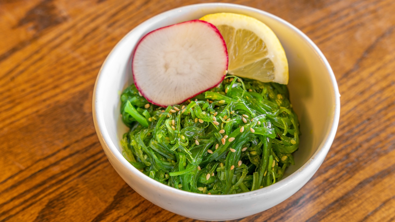 Marinated seaweed with sesame seed.