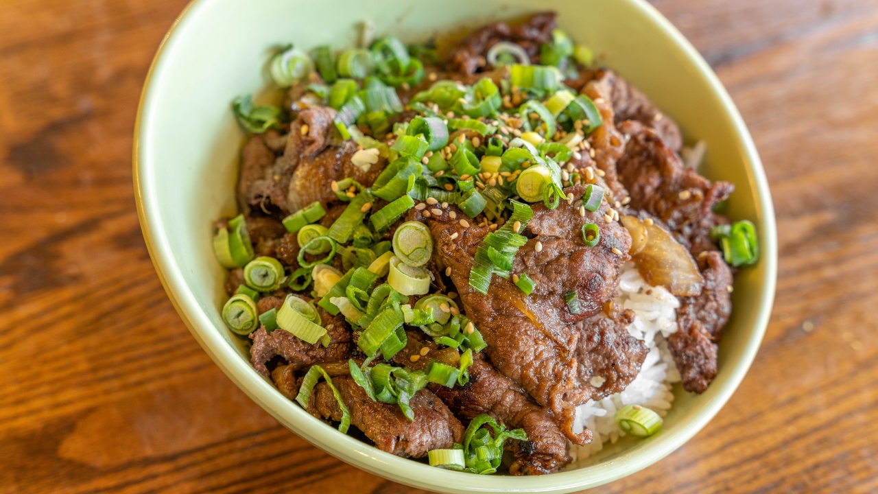 Thin slices of beef steak marinated in a Korean style house sauce, stir fried with sweet onions and served over rice.