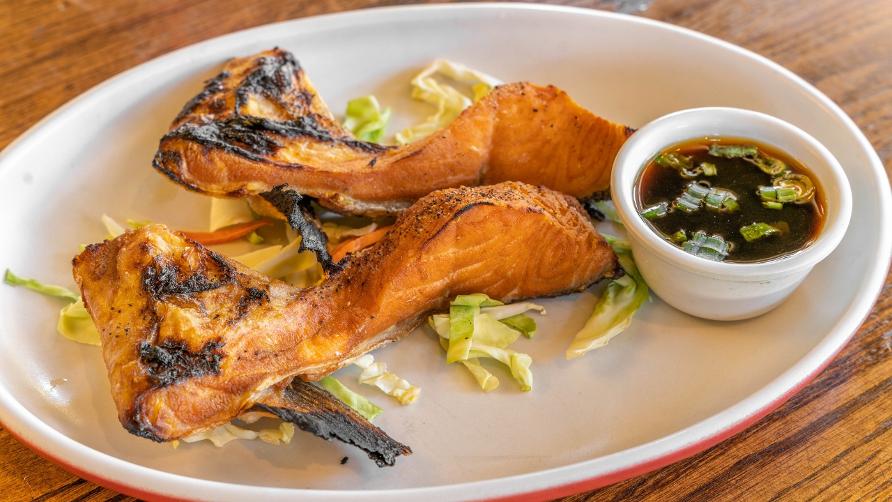 Broiled salmon collar served with a ponzu sauce.