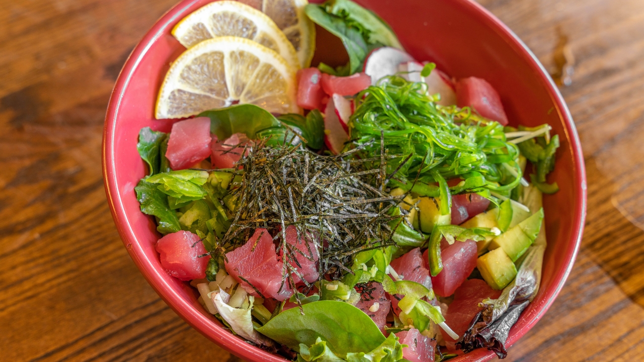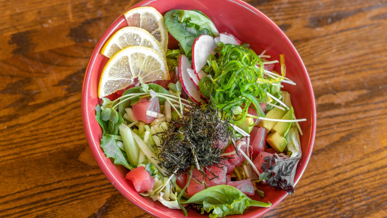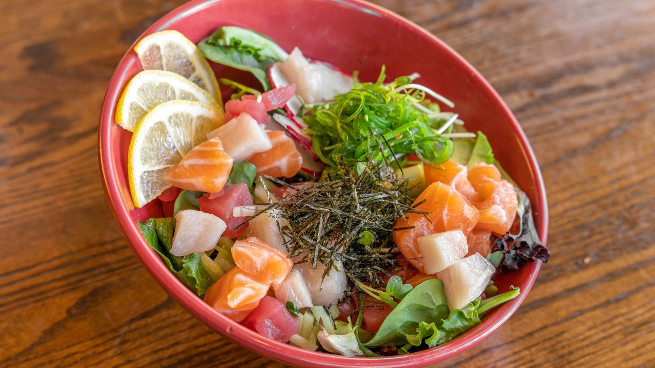 Salmon, Tuna, & Yellowtail with a layer of spring mix, seaweed salad, avocado, cucumber, radish, served over seasoned rice, drizzled with a house poke sauce.