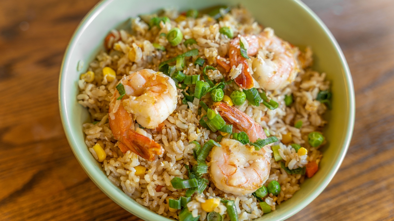 Fried rice with stir fried vegetables, egg, and Shrimp.