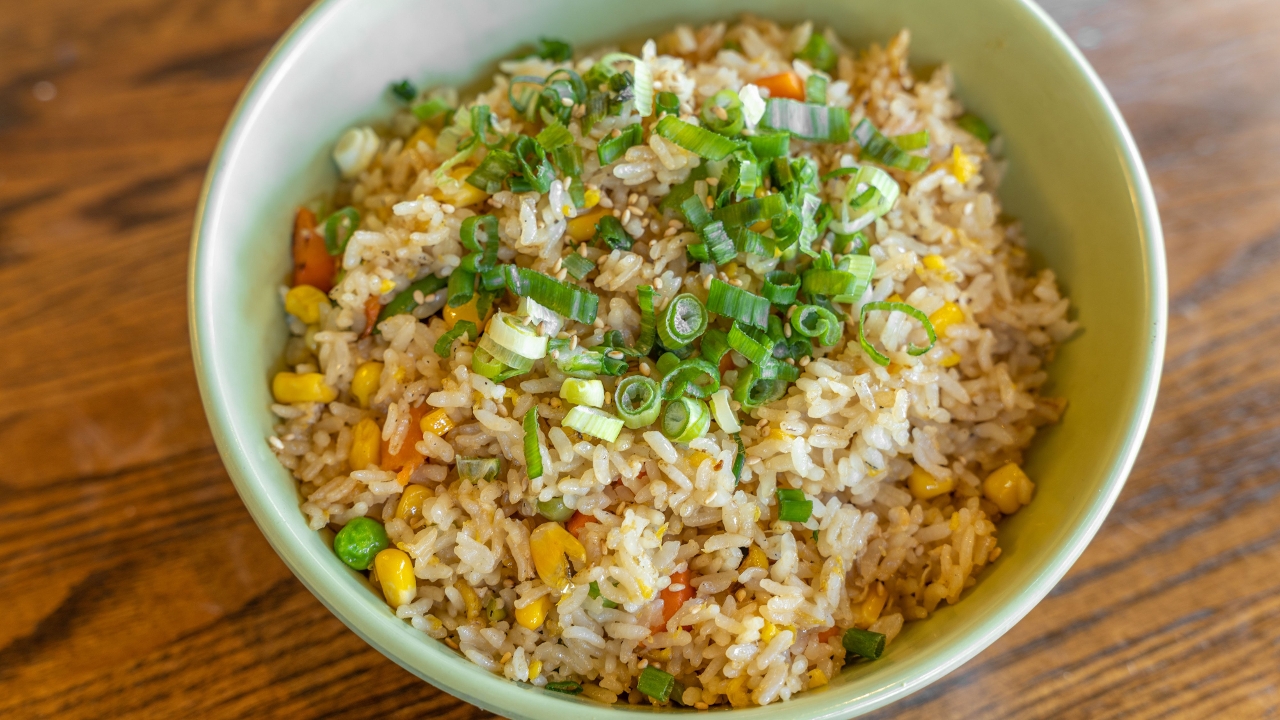 Small bowl of seasoned calrose rice.