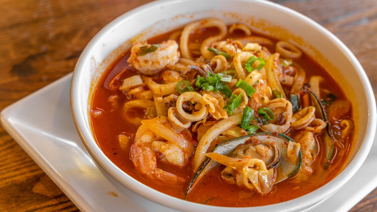 Japanese thick wheat noodles with vegetables & seafood in a spicy broth.
