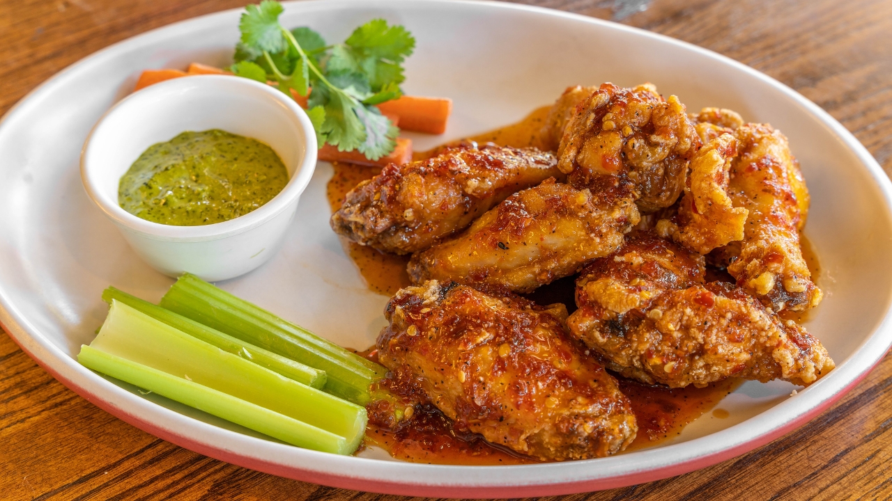 6 pieces of deep fried breaded wings tossed in a house made spicy sauce & served with a cilantro sauce.