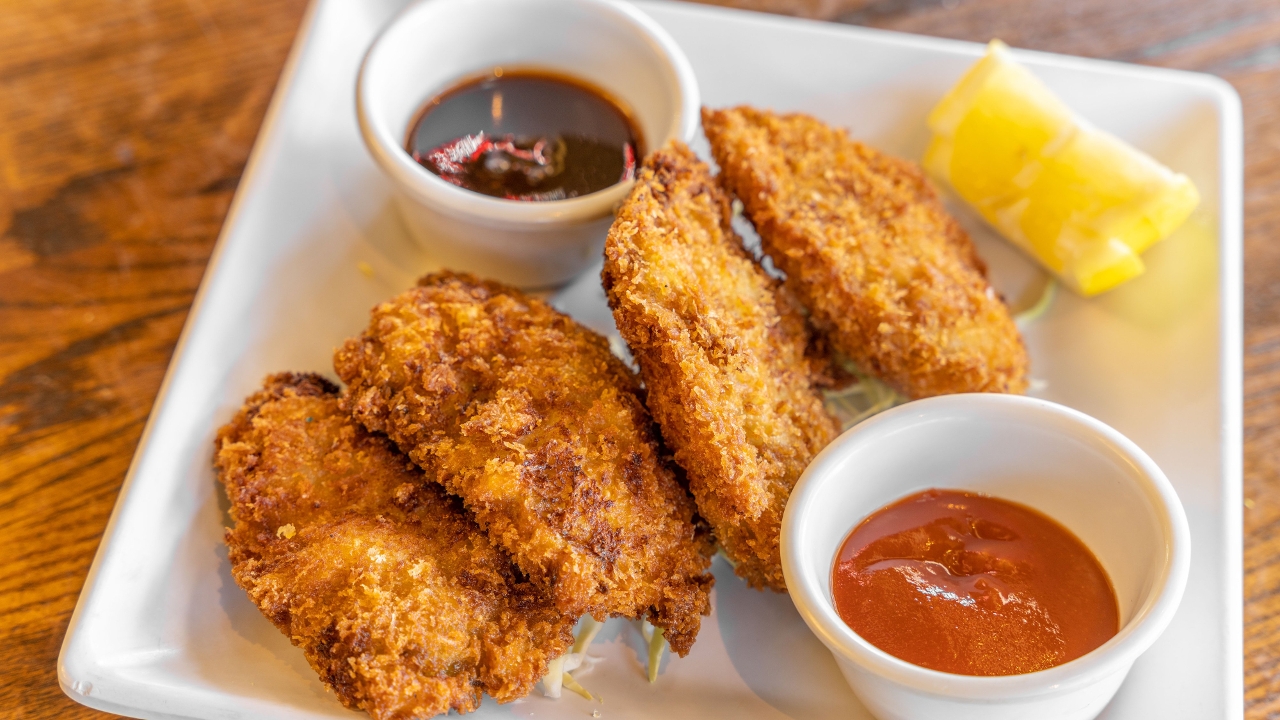 Four pieces of panko breaded oysters served with a katsu & cocktail sauce.