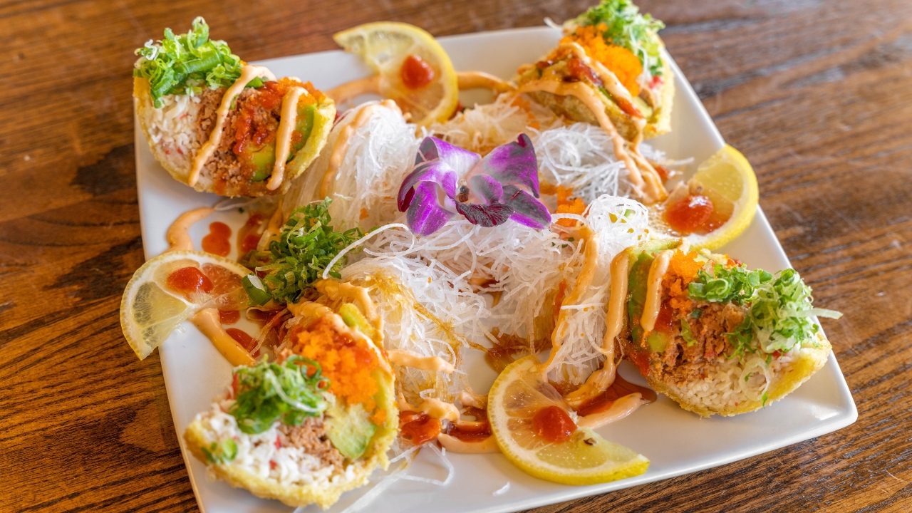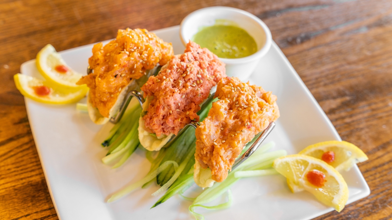 Spicy tuna, spicy salmon, spicy yellowtail in deep-fried gyoza skin, served with avocado, tomato, onion, and honey jalapeno sauce.