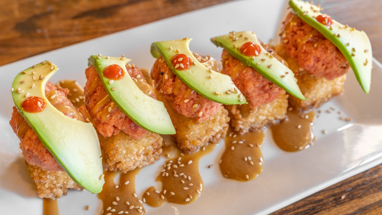 Deep-fried rice balls with spicy tuna and avocado on top, served with miso sauce.
