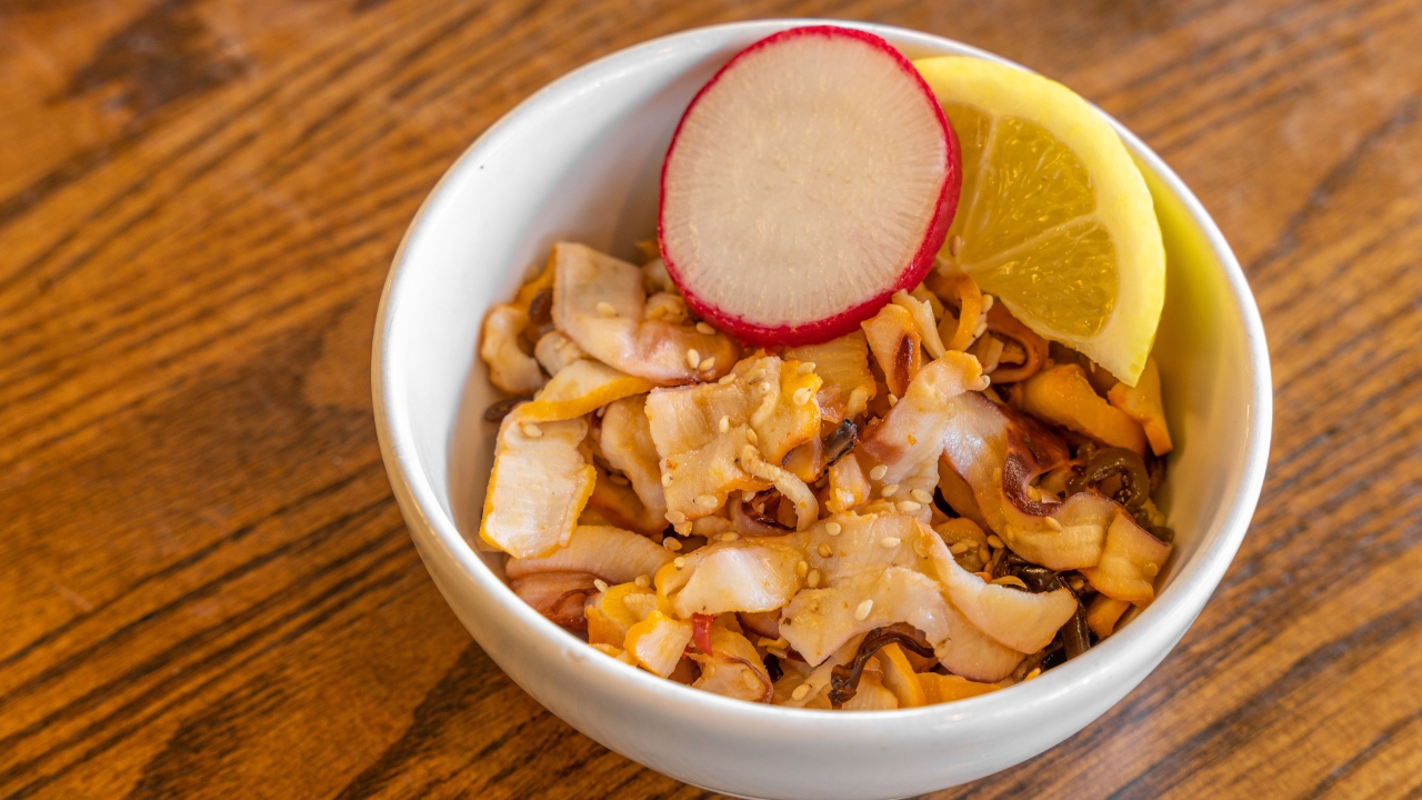Seasoned squid mixed with Japanese mountain vegetables.
