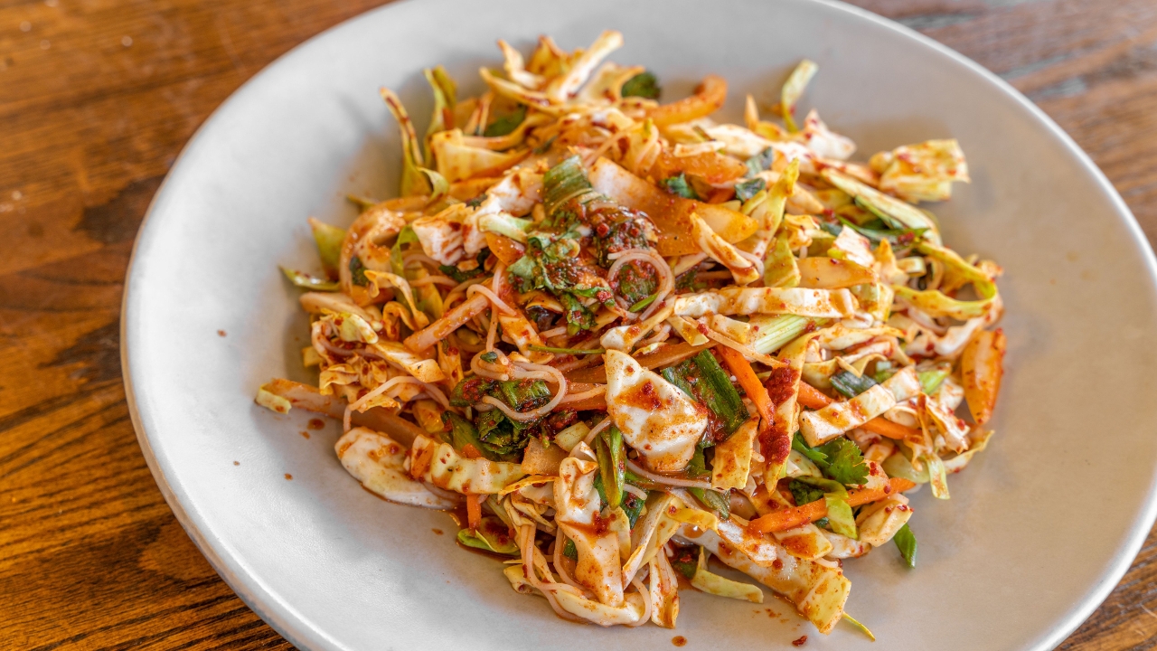 Rice noodles with cabbage, carrots, green onions, and cilantro in a spicy sauce. Served cold.