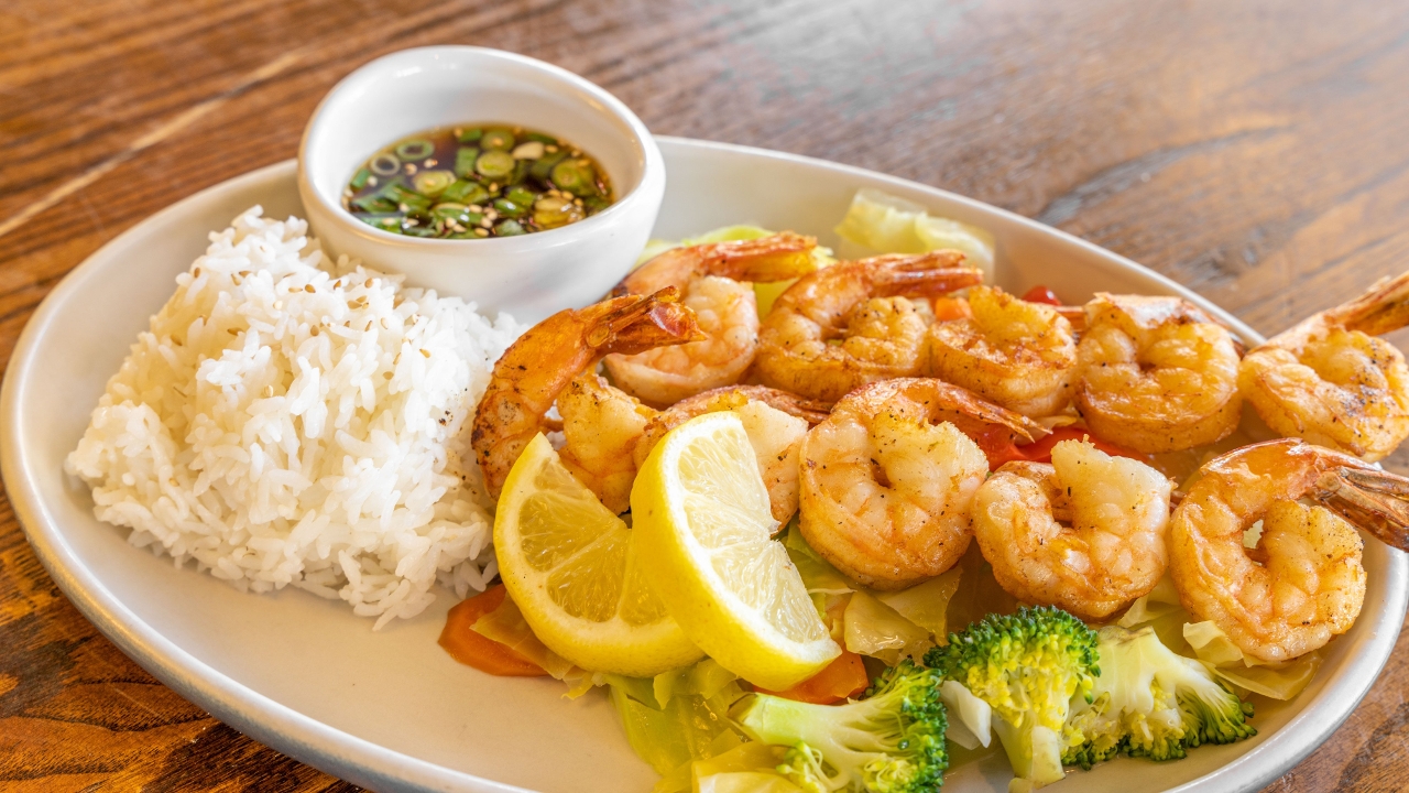 10 grilled shrimp with stir fried vegetables.